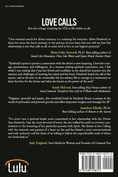 LOVE CALLS touching the YES to life within us all Allow Kimberly to share her story, her hero's journey, in the privacy of your heart and you will see that this relationship is one that calls us all, at some level to live to our highest potential. Brian Luke Seaward, Ph.D. Quiet Mind, Fearless Heart Kimberly's quest to pursue a connection with the divine is awe-inspiring. As a woman seeking spiritual connection, too, I felt while I was reading that I was her friend and confidant...Kimberly heard the call of the mystic, and as all seem to do, eventually, left the solitary life to emerge as a missionary to share her love for the divine and what she knows as the power of the soul. Sarah McLean, Soul-Centered: Transform Your Life in 8 Weeks with Meditation Poignant, powerful and poetic, this wonderful book by Kimberly Braun is unique in the world of spirituality and personal growth and offers important insights and messages for all. Jonathan Ellerby, Ph.D., Return to the Sacred
