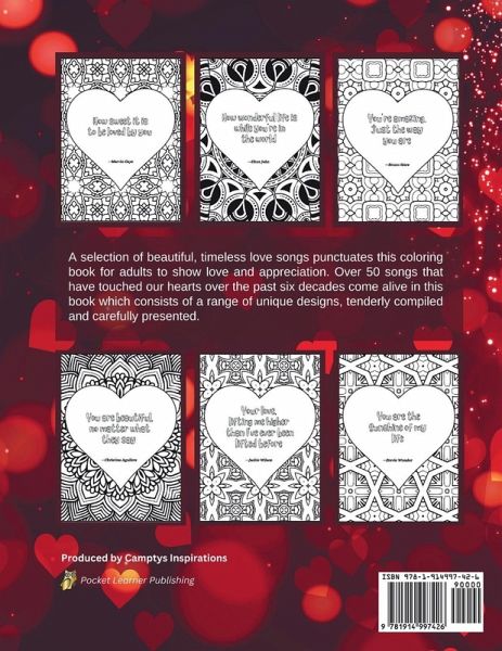 Explore our Love Coloring Book Where Hearts and Melodies Collide! Unleash the power of love and music with this Love Coloring Book for Adults, a unique curation that seamlessly blends the art of coloring with the magic of popular love songs. Immerse yourself in a symphony of hearts, each adorned with lyrics from timeless love classics, creating an enchanting experience for both coloring enthusiasts and music lovers alike. Each page is a work of art waiting to be brought to life with your colors and imagination. Whether you're a seasoned colorist or just looking to relax and unwind, this book is perfect for you. With a range of difficulty levels, there's something for everyone. Featuring:Heartfelt Designs - Embark on a visual journey through intricately designed hearts, each pulsating with the essence of classic love songs. Every stroke brings to life a beautiful illustration and a melody that resonates with the heart. From soulful ballads to upbeat anthems, this coloring book transforms coloring into a harmonious celebration. Careful Song Selection - Collated with precision, each page features lyrics from popular love songs, creating a melodic ambiance as you bring the designs to life. From romantic classics to contemporary hits, this book is a curated playlist of emotions that adds an extra layer of connection to your coloring experience. Perfect Gift for Music Lovers - If you are looking for the ideal gift for the music aficionado in your life, the Love Coloring Book is the answer. Its unique fusion of art and music makes it a thoughtful and memorable gift for birthdays, anniversaries, or any occasion that celebrates love and creativity. Ideal Gift for Lovers - Order your copy of the Love Coloring Book now and let the marriage of hearts and melodies harmonize your world while elevating your coloring experience to new heights. Immerse yourself in the realm where colors and songs unite, creating a masterpiece that is as delightful to the eyes as it is to the ears. Customer Testimonials - Join the chorus of (over 90%) satisfied customers who have experienced the magic of the Love Coloring Book. Read their testimonials, expressing delight in the fusion of art and music, making this book a standout choice for those seeking a truly unique coloring adventure. This coloring book is part of Camptys Inspirations' ever-expanding range of inspiring and empowering books. We invite you to get creative and celebrate your special moments in style.