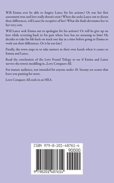 Love Conquers All is the conclusion of the Love Found Trilogy. Will Emma ever be able to forgive Lance for his treatment of her? Or was her first assessment true and love doesn't exist? Or is it her? When she seeks him out to discuss their differences, will Lance be receptive to her? What she finds when she does seek him out devastated her to her very core. Will she ever be able to find love? Will Lance seek out Emma to apologize for his actions? Or will he give up on love while reverting back to his past where love had no meaning to him? Deciding to take one day at a time to get his life back on track before going to Emma and asking for forgiveness. Or is he too late? Both Emma and Lance continue with their separate lives until their friends decide to take matters into their own hands. Read the conclusion of the Love Found Trilogy to see if Emma and Lance survive in the town's meddling in...Love Conquers All Intended for mature audiences, 18+.