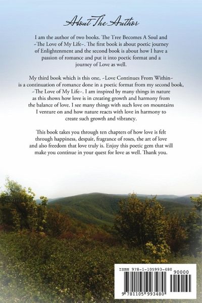 The book, ~Love Continues From Within~ is a continuation from my second book, ~The Love of My Life~ in a romantic poetic journey that love can be felt in each poem I wrote. There are chapters that contain fragrance from a rose, to some hurt and despair, letting go and even freedom in love. Please enjoy and embark once again on a journey of passion and romance in my latest creation of ~Love Continues From Within~. I am inspired by the Soul* that is within and its wisdom that it gives me to create wonderful scenarios it allows me to see with. My passion also comes from mountain climbing with nature and the love in harmony that is all around to give growth from balance that love has to offer there as well. Enjoy and thank you.