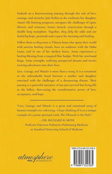 Embark on a heartwarming journey through this tale of love, courage, and miracles. Join Robin as she confronts her daughter Anna's life-limiting prognosis, navigates the challenges of cystic fibrosis, and witnesses Anna's miracle resurrection through a double lung transplant. Together, they defy the odds and are fueled by hope, gratitude and a quest for meaning and healing. Follow them as they meet a Tibetan lama who opens their world with ancient healing rituals, have an audience with the Dalai Lama, and in one of her darkest hours, Anna experiences a healing blessing from a magical blue budgie. With her newfound lungs, Anna triumphs, realizing unexpected dreams and invites exciting adventures into their lives. Love, Courage, and Miracles is more than a story. It is a testament to the unbreakable bond between a mother and daughter entwined with the challenges of a devastating disease. Their journey is a powerful narrative of not just survival but living life to the fullest, showcasing the transformative power of love, acceptance, and hope. "Love, Courage, and Miracles is a great and emotional story of human triumph over adversity-I kept thinking of it as a unique example of a prime spiritual truth: The Obstacle is the Path." - Dr. Richard B. Moss, Professor Emeritus Pediatrics-Pulmonary Medicine at Stanford University School of Medicine
