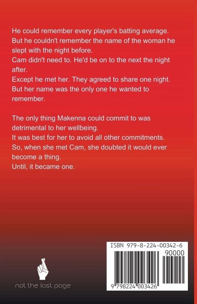 He could remember every player's batting average. But he couldn't remember the name of the woman he slept with the night before. Cam didn't need to. He'd be on to the next the night after. Except he met her. They agreed to share one night. But her name was the only one he wanted to remember. The only thing Makenna could commit to was detrimental to her wellbeing. It was best for her to avoid all other commitments. So, when she met Cam, she doubted it would ever become a thing. Until, it became one.