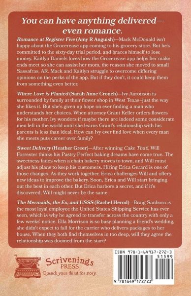 Romance at Register Five (Amy R Anguish)-Mack McDonald isn't happy about the Grocerease app coming to his grocery store. But he's committed to the sixty-day trial period, and braces himself to lose money. Kaitlyn Daniels loves how the Grocerease app helps her make ends meet so she can assist her mom, the reason she moved to small Sassafras, AR. Mack and Kaitlyn struggle to overcome differing opinions on the perks of the app. But if they don't, it could keep them from something even better. Where Love is Planted (Sarah Anne Crouch)-Ivy Aaronson is surrounded by family at their flower shop in West Texas-just the way she likes it. But she's given up hope on ever finding a man who understands her choices. When attorney Grant Keller orders flowers for his mother, Ivy wonders if maybe there are indeed some considerate men left in the world until she learns Grant's relationship with his parents is less than ideal. How can Ivy ever find love when every man she meets puts career over family? Sweet Delivery (Heather Greer)-After winning Cake That!, Will Forrester thinks his Pastry Perfect baking dreams have come true. The sweetness fades when a chain bakery moves to town, and Will must adjust his plans to keep his customers. Hiring Erica Gerard is one of those changes. As they work together, Erica challenges Will and offers new ideas to improve the bakery. Soon, Erica and Will start bringing out the best in each other. But Erica harbors a secret, and if it's discovered, Will might never be the same. The Mermaids, the Ex, and USSS (Rachel Herod)-Braig Sanborn is the most loyal employee the United States Shipping Service has ever seen, which is why he agreed to transfer across the country with only a few weeks' notice. Ella Morrison is so busy planning a friend's wedding, she didn't expect to fall for the carrier who delivers packages to her house. When they both find themselves in too deep, will they agree the relationship was doomed from the start?