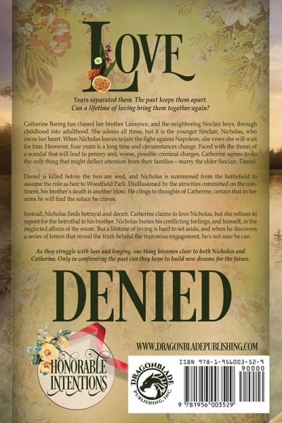 Years separated them. The past keeps them apart. Can a lifetime of loving bring them together again? Catherine Baring has chased her brother Laurence, and the neighboring Sinclair boys, through childhood into adulthood. She adores all three, but it is the younger Sinclair, Nicholas, who owns her heart. When Nicholas leaves to join the fight against Napoleon, she vows she will wait for him. However, four years is a long time and circumstances change. Faced with the threat of a scandal that will lead to penury and, worse, possible criminal charges, Catherine agrees to do the only thing that might deflect attention from their families-marry the elder Sinclair, Daniel. Daniel is killed before the two are wed, and Nicholas is summoned from the battlefield to assume the role as heir to Woodfield Park. Disillusioned by the atrocities committed on the continent, his brother's death is another blow. He clings to thoughts of Catherine, certain that in her arms he will find the solace he craves. Instead, Nicholas finds betrayal and deceit. Catherine claims to love Nicholas, but she refuses to repent for the betrothal to his brother. Nicholas buries his conflicting feelings, and himself, in the neglected affairs of the estate. But a lifetime of loving is hard to set aside, and when he discovers a series of letters that reveal the truth behind the traitorous engagement, he's not sure he can. As they struggle with loss and longing, one thing becomes clear to both Nicholas and Catherine. Only in confronting the past can they hope to build new dreams for the future. Honorable Intentions Love Denied Love Abandoned Love Unraveled