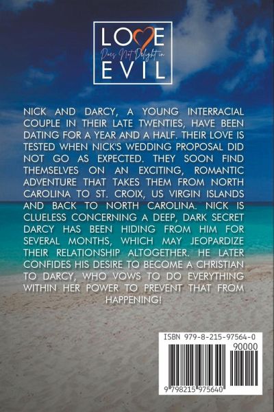 Nick and Darcy, a young interracial couple in their late twenties, have been dating for a year and a half. Their love is tested when Nick's wedding proposal does not go as planned. They soon find themselves on an exciting, romantic adventure that takes them from North Carolina to St. Croix, US Virgin Islands, and back to North Carolina. Nick is clueless about a deep, dark secret Darcy has been hiding from him for several months, which may jeopardize their relationship altogether. He later confides his desire to become a Christian to Darcy, who secretly vows to do everything in her power to prevent that from happening! All 125 captivating pages of this book will draw you into a world of love, lies, danger, faith, and complicated scenes of romance!