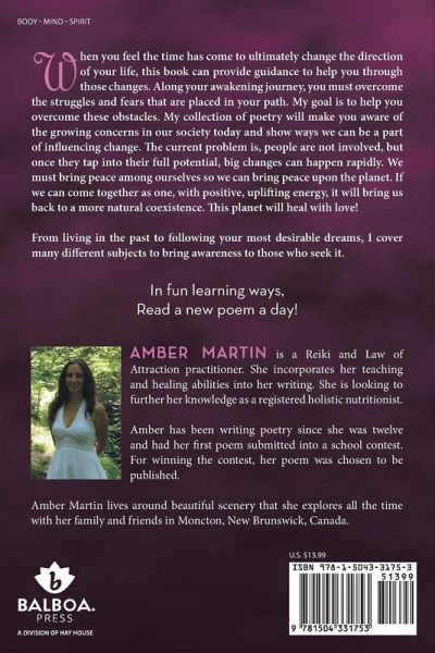 When you feel the time has come to ultimately change the direction of your life, this book can provide guidance to help you through those changes. Along your awakening journey, you must overcome the struggles and fears that are placed in your path. My goal is to help you overcome these obstacles. My collection of poetry will make you aware of the growing concerns in our society today and show ways we can be a part of influencing change. The current problem is, people are not involved, but once they tap into their full potential, big changes can happen rapidly. We must bring peace among ourselves so we can bring peace upon the planet. If we can come together as one, with positive, uplifting energy, it will bring us back to a more natural coexistence. This planet will heal with love! From living in the past to following your most desirable dreams, I cover many different subjects to bring awareness to those who seek it. In fun learning ways, Read a new poem a day!