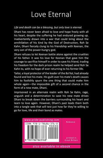 Life and death can be a blessing, but only love is eternal. Dhani has never been afraid to love and hope freely with all his heart, despite the suffering he had endured growing up. Inadvertently drawn into a war that could bring about the annihilation of his kind by the God of Destruction, Roh Se Kahn, Dhani fiercely clung to his friendship with Keenan, the very son of the power-hungry god. Dhani refuses to let Keenan battle alone against the cruelties of his father. It was his love for Keenan that gave him the courage to sacrifice himself in order to save his friend, trading his freedom for the dark prison realm he helped send Roh Se Kahn to, with no hope of ever returning to his former life. Tailor, a loyal protector of the leader of the Ba'Kal, had already found and lost his mate. His guilt over his mate's death causes him to foolishly spurn the one thing that could make him whole again-the impossible gift of a second chance in the form of a new mate, Dhani. Imprisoned in an alternate realm with Roh Se Kahn, rage, anguish and a determination to save his new mate drives Dhani to break down the barriers surrounding his heart and learn to love again. However, Dhani's past leads them both into a tangle web that will test just how far they're willing to go for love, life and their bond as mates.