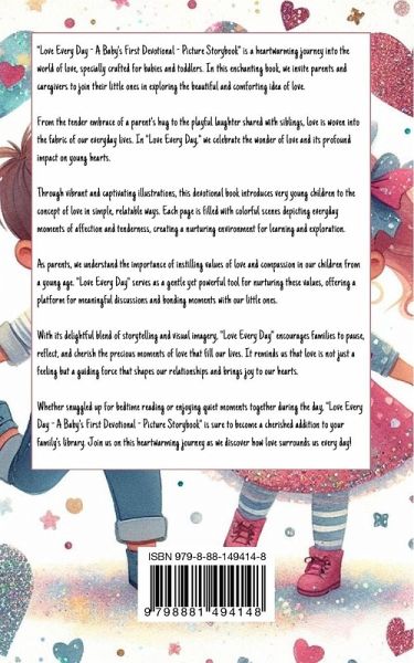 "Love Every Day - A Baby's First Devotional - Picture Storybook" is a heartwarming journey into the world of love, specially crafted for babies and toddlers. In this enchanting book, we invite parents and caregivers to join their little ones in exploring the beautiful and comforting idea of love. From the tender embrace of a parent's hug to the playful laughter shared with siblings, love is woven into the fabric of our everyday lives. In "Love Every Day," we celebrate the wonder of love and its profound impact on young hearts. Through vibrant and captivating illustrations, this devotional book introduces very young children to the concept of love in simple, relatable ways. Each page is filled with colorful scenes depicting everyday moments of affection and tenderness, creating a nurturing environment for learning and exploration. As parents, we understand the importance of instilling values of love and compassion in our children from a young age. "Love Every Day" serves as a gentle yet powerful tool for nurturing these values, offering a platform for meaningful discussions and bonding moments with our little ones. With its delightful blend of storytelling and visual imagery, "Love Every Day" encourages families to pause, reflect, and cherish the precious moments of love that fill our lives. It reminds us that love is not just a feeling but a guiding force that shapes our relationships and brings joy to our hearts. Whether snuggled up for bedtime reading or enjoying quiet moments together during the day, "Love Every Day - A Baby's First Devotional - Picture Storybook" is sure to become a cherished addition to your family's library. Join us on this heartwarming journey as we discover how love surrounds us every day!