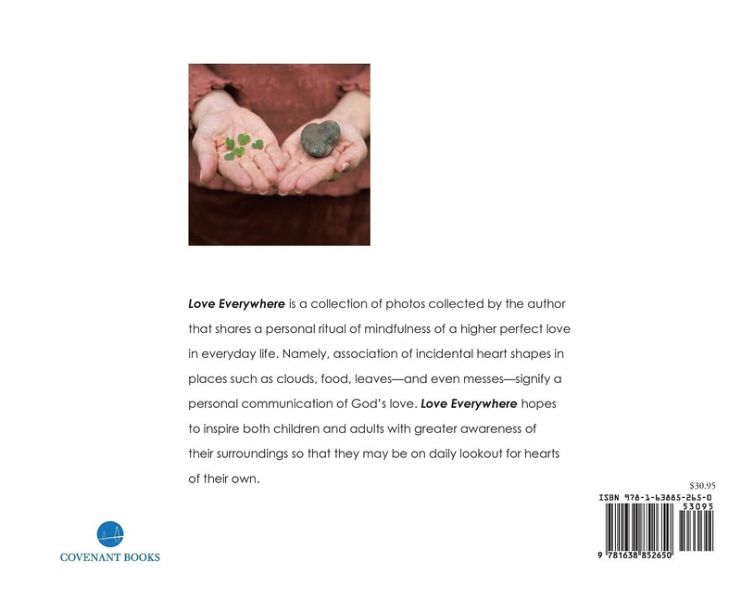 Love, everywhere is a collection of photos collected by the author that shares a personal ritual of mindfulness of a higher perfect love in everyday life. Namely, association of incidental heart shapes in places such as clouds, food, leaves and even messes signify a personal communication of God's love. Love, everywhere hopes to inspire both children and adults with greater awareness of their surroundings so that they may be on daily lookout for hearts of their own.