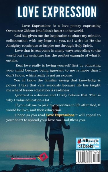 Love Expressions is a love poetry expressing Owenazee Gideon Imafidon's heart to the world.God has given me the inspiration to share my mind in collaboration with my heart to you, so I write as He the Almighty continues to inspire me through Holy Spirit. Love that is real come in many ways according to the world but the scripture has the perfect example of what it entails. Real love really is loving yourself first by educating your mind because being ignorant to me is more than I don't know, which really is not an excuse. You all know the familiar saying that knowledge is power. I take that very seriously because life has taught me a hard lesson education is readiness. Ignorant is a disease and I truly believe that. That is why I value education a lot. If you ask me to pick my priorities in life after God, It would be love, and then education. I hope as you read Love Expressions it will appeal to your heart to spread your love too. God Bless you.