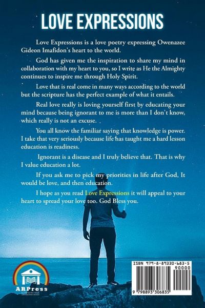 Love Expressions is a love poetry expressing Owenazee Gideon Imafidon's heart to the world. God has given me the inspiration to share my mind in collaboration with my heart to you, so I write as He the Almighty continues to inspire me through Holy Spirit. Love that is real come in many ways according to the world but the scripture has the perfect example of what it entails. Real love really is loving yourself first by educating your mind because being ignorant to me is more than I don't know, which really is not an excuse. You all know the familiar saying that knowledge is power. I take that very seriously because life has taught me a hard lesson education is readiness. Ignorant is a disease and I truly believe that. That is why I value education a lot. If you ask me to pick my priorities in life after God, It would be love, and then education. I hope as you read Love Expressions it will appeal to your heart to spread your love too. God Bless you.