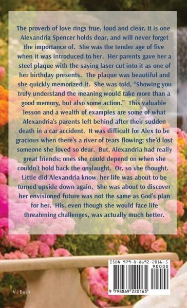 The proverb of love rings true, loud and clear. It is one Alexandria Spencer holds dear, and will never forget the importance of. She was the tender age of five when it was introduced to her. Her parents gave her a steel plaque with the saying laser cut into it as one of her birthday presents. The plaque was beautiful and she quickly memorized it. She was told, "Showing you truly understand the meaning would take more than a good memory, but also some action." This valuable lesson and a wealth of examples are some of what Alexandria's parents left behind after their sudden death in a car accident. It was difficult for Alex to be gracious when there's a river of tears flowing; she'd lost someone she loved so dear. But, Alexandria had really great friends; ones she could depend on when she couldn't hold back the onslaught. Or, so she thought. Little did Alexandria know, her life was about to be turned upside down again. She was about to discover her envisioned future was not the same as God's plan for her. His, even though she would face life threatening challenges, was actually much better.