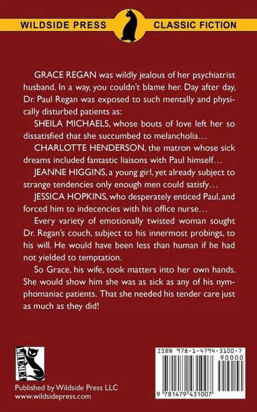 GRACE REGAN was wildly jealous of her psychiatrist husband. In a way, you couldn’t blame her. Day after day, Dr. Paul Regan was exposed to such mentally and physically disturbed patients as: SHEILA MICHAELS, whose bouts of love left her so dissatisfied that she succumbed to melancholia… CHARLOTTE HENDERSON, the matron whose sick dreams included fantastic liaisons with Paul himself… JEANNE HIGGINS, a young girl, yet already subject to strange tendencies only enough men could satisfy… JESSICA HOPKINS, who desperately enticed Paul, and forced him to indecencies with his office nurse… Every variety of emotionally twisted woman sought Dr. Regan's couch, subject to his innermost probings, to his will. He would have been less than human if he had not yielded to temptation. So Grace, his wife, took matters into her own hands. She would show him she was as sick as any of his nymphomaniac patients. That she needed his tender care just as much as they did!