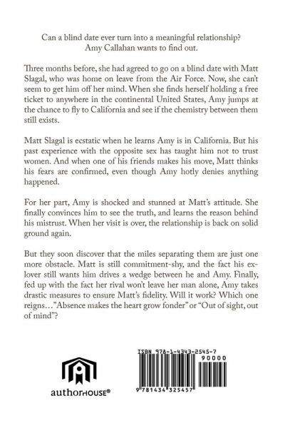 Can a blind date ever turn into a meaningful relationship? Amy Callahan wants to find out Three months before, she had agreed to go on a blind date with Matt Slagal, who was home on leave from the Air Force. Now, she can't seem to get him off her mind. When she finds herself holding a free ticket to anywhere in the continental United States, Amy jumps at the chance to fly to California and see if the chemistry between them still exists. Matt Slagal is ecstatic when he learns Amy is in California. But his past experience with the opposite sex has taught him not to trust women. And when one of his friends makes his move, Matt thinks his fears are confirmed, even though Amy hotly denies anything happened. For her part, Amy is shocked and stunned at Matt's attitude. She finally convinces him to see the truth, and learns the reason behind his mistrust. When her visit is over, the relationship is back on solid ground again. But they soon discover that the miles separating them are just one more obstacle. Matt is still commitment-shy, and the fact his ex-lover still wants him drives a wedge between he and Amy. Finally, fed up with the fact her rival won't leave her man alone, Amy takes drastic measures to ensure Matt's fidelity. Will it work? Which one reigns."Absence makes the heart grow fonder" or "Out of sight, out of mind"?