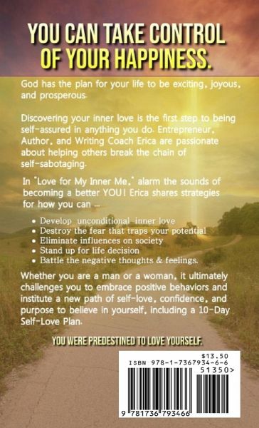 You CAN take control of your HAPPINESS. God has the plan for your life to be exciting, joyous, and prosperous. Do you battle with insecurity? Do you want more confidence within yourself? Do you want to fulfill your dreams with fear? One sure way to make that happen is to reposition your SELF-LOVE into shape. Discovering your inner love is the first step to being self-assured in anything you do. Entrepenurer, Author, and Writing Coach Erica are passionate about helping others break the chain of self-sabotaging. In "Love for My Inner Me," alarm the sounds of becoming a better YOU! Erica shares strategies for how you can ...Develop unconditional inner love Destroy the fear that traps your potential Eliminate influences on society Stand up for life decisions Battle the negative thoughts & feelings. Whether you are a man or a woman, it ultimately challenges you to embrace positive behaviors and institute a new path of self-love, confidence, and purpose to believe in yourself, including a 10-Day Self-Love Plan. It's smaller enough to carry in your purse, back pocket, or just on the go. You were predestined to love yourself. Unlock your inner self-love and stand out boldly.