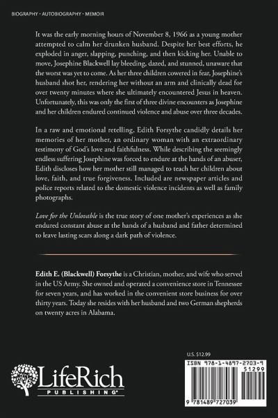It was the early morning hours of November 8, 1966 as a young mother attempted to calm her drunken husband. Despite her best efforts, he exploded in anger, slapping, punching, and then kicking her. Unable to move, Josephine Blackwell lay bleeding, dazed, and stunned, unaware that the worst was yet to come. As her three children cowered in fear, Josephine's husband shot her, rendering her without an arm and clinically dead for over twenty minutes where she ultimately encountered Jesus in heaven. Unfortunately, this was only the first of three divine encounters as Josephine and her children endured continued violence and abuse over three decades. In a raw and emotional retelling, Edith Forsythe candidly details her memories of her mother, an ordinary woman with an extraordinary testimony of God's love and faithfulness. While describing the seemingly endless suffering Josephine was forced to endure at the hands of an abuser, Edith discloses how her mother still managed to teach her children about love, faith, and true forgiveness. Included are newspaper articles and police reports related to the domestic violence incidents as well as family photographs. Love for the Unlovable is the true story of one mother's experiences as she endured constant abuse at the hands of a husband and father determined to leave lasting scars along a dark path of violence.