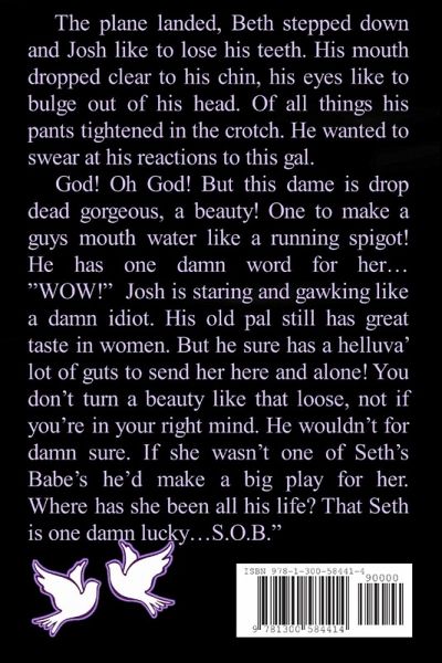 The plane landed, Beth stepped down and Josh like to lose his teeth. His mouth dropped clear to his chin, his eyes like to bulge out of his head. Of all things his pants tightened in the crotch. He wanted to swear at his reactions to this gal. God! Oh God! But this dame is drop dead gor-geous, a beauty! One to make a guys mouth water like a running spigot! He has one damn word for her... "WOW!" Josh is staring and gawking like a damn idiot. His old pal still has great taste in women. But he sure has a helluva' lot of guts to send her here and alone! You don't turn a beauty like that loose, not if you're in your right mind. He wouldn't for damn sure. If she wasn't one of Seth's Babe's he'd make a big play for her. Where has she been all his life? That Seth is one damn lucky...S.O.B."