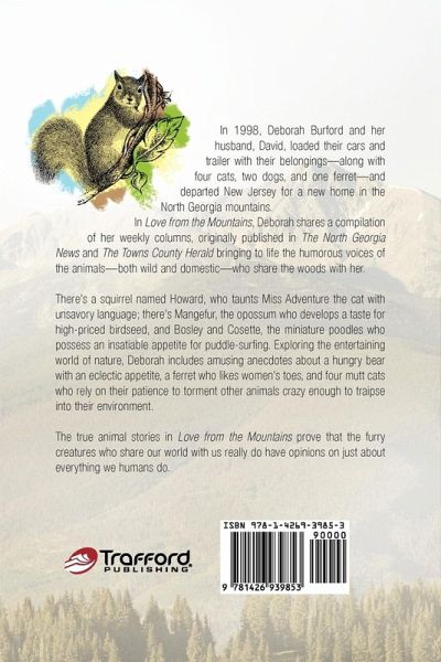 In 1998, Deborah Burford and her husband, David, loaded their cars and trailer with their belongings-along with four cats, two dogs, and one ferret-and departed New Jersey for a new home in the North Georgia mountains. In Love from the Mountains, Deborah shares a compilation of her weekly columns, originally published in The North Georgia News and The Towns County Herald, bringing to life the humorous voices of the animals-both wild and domestic-who share the woods with her. There's a squirrel named Howard, who taunts Miss Adventure the cat with unsavory language; there's Mangefur, the opossum who develops a taste for high-priced birdseed, and Bosley and Cosette, the miniature poodles who possess an insatiable appetite for puddle-surfing. Exploring the entertaining world of nature, Deborah includes amusing anecdotes about a hungry bear with an eclectic appetite, a ferret who likes women's toes, and four mutt cats who rely on their patience to torment other animals crazy enough to traipse into their environment. The true animal stories in Love from the Mountains prove that the furry creatures who share our world with us really do have opinions on just about everything we humans do.