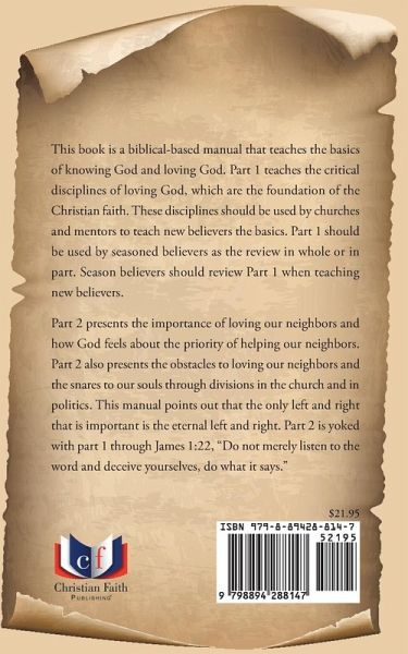 This book is a biblical-based manual that teaches the basics of knowing God and loving God. Part 1 teaches the critical disciplines of loving God, which are the foundation of the Christian faith. These disciplines should be used by churches and mentors to teach new believers the basics. Part 1 should be used by seasoned believers as the review in whole or in part. Season believers should review Part 1 when teaching new believers. Part 2 presents the importance of loving our neighbors and how God feels about the priority of helping our neighbors. Part 2 also presents the obstacles to loving our neighbors and the snares to our souls through divisions in the church and in politics. This manual points out that the only left and right that is important is the eternal left and right. Part 2 is yoked with part 1 through James 1:22, "Do not merely listen to the word and deceive yourselves, do what it says."