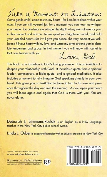 Take a Moment to Listen: Come gentle child, come rest in my heart--for I am here deep within your own. If you can still yourself just for a moment, you can hear me whisper your name. You can hear me whisper the depth of my eternal love for you, in this moment and always. Let me quiet your frightened mind, and hold your unsettled heart--for I will give you peace, the very moment you ask. Let me fill your heart with my love, and wrap my arms around you in absolute tenderness and grace. In that moment you will know with certainty that I am forever with you. Love, God This book is an invitation to God's loving presence. It is an invitation to deepen your relationship with God. It includes a quote from a spiritual leader, commentary, a Bible quote, and a guided meditation. It also includes a moment to fully imagine God speaking directly to your own heart. This gives you an invitation to learn to turn to his love and presence throughout the day and into the evening. As you open your heart you will learn again and again that God is there with you. You are never alone.