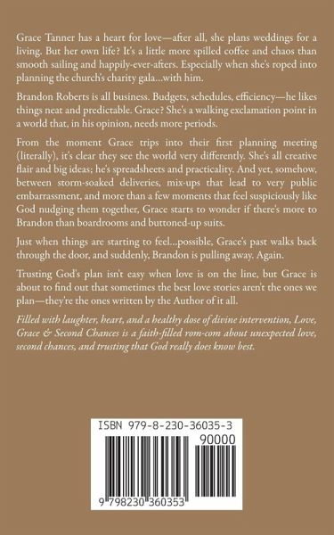 Grace Tanner has a heart for love-after all, she plans weddings for a living. But her own life? It's a little more spilled coffee and chaos than smooth sailing and happily-ever-afters. Especially when she's roped into planning the church's charity gala...with him. Brandon Roberts is all business. Budgets, schedules, efficiency-he likes things neat and predictable. Grace? She's a walking exclamation point in a world that, in his opinion, needs more periods. From the moment Grace trips into their first planning meeting (literally), it's clear they see the world very differently. She's all creative flair and big ideas; he's spreadsheets and practicality. And yet, somehow, between storm-soaked deliveries, mix-ups that lead to very public embarrassment, and more than a few moments that feel suspiciously like God nudging them together, Grace starts to wonder if there's more to Brandon than boardrooms and buttoned-up suits. Just when things are starting to feel...possible, Grace's past walks back through the door, and suddenly, Brandon is pulling away. Again. Trusting God's plan isn't easy when love is on the line, but Grace is about to find out that sometimes the best love stories aren't the ones we plan-they're the ones written by the Author of it all. Filled with laughter, heart, and a healthy dose of divine intervention, Love, Grace & Second Chances is a faith-filled rom-com about unexpected love, second chances, and trusting that God really does know best.