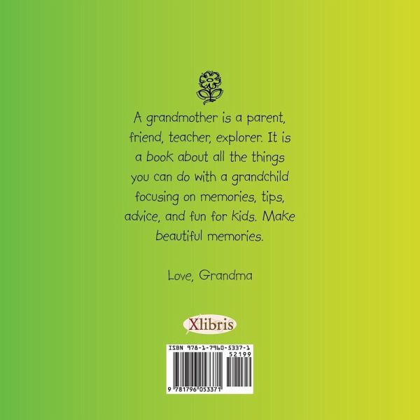 A grandmother is a parent, friend, teacher, explorer. It is a book about all the things you can do with a grandchild focusing on memories, tips, advice, and fun for kids. Make beautiful memories. Love, Grandma