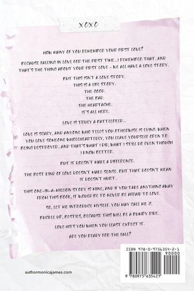 How many of you remember your first love? Because falling in love for the first time...I remember that. And that's the thing about your first love-we all have a love story. But this isn't a love story.This is a life story.The good.The bad.The heartache.It's all here. Love is truly a battlefield... Love is scary, and anyone who tells you otherwise is lying. When you love someone wholeheartedly, you leave yourself open to being destroyed...and that's what I did, what I still do even though I know better. But it doesn't make a difference. The best kind of love doesn't make sense. But that doesn't mean it doesn't hurt. This one-in-a-million story is mine, and if you take anything away from this book, it would be to never be afraid to love. So, let me introduce myself. You may call me Z.Buckle up, besties, because this will be a bumpy ride. Love hits you when you least expect it. Are you ready for the fall?