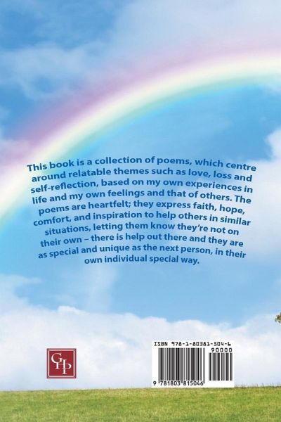 The poems in this book are a collection of experiences and reflection, based on my own life and that of others, the poems are written purely heartfelt, to express the faith, hope, comfort and wisdom, to help other people in similar situations and conflicts, to let them know that they are not on their own, there is help out there, as an individual, they are as special and as unique as the next person, in their own individual way, you are unique, you are special, you are loved.