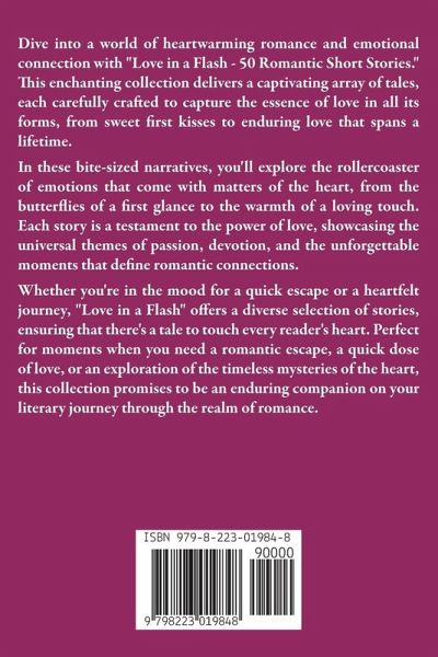 Dive into a world of heartwarming romance and emotional connection with "Love in a Flash - 50 Romantic Short Stories." This enchanting collection delivers a captivating array of tales, each carefully crafted to capture the essence of love in all its forms, from sweet first kisses to enduring love that spans a lifetime. In these bite-sized narratives, you'll explore the rollercoaster of emotions that come with matters of the heart, from the butterflies of a first glance to the warmth of a loving touch. Each story is a testament to the power of love, showcasing the universal themes of passion, devotion, and the unforgettable moments that define romantic connections. Whether you're in the mood for a quick escape or a heartfelt journey, "Love in a Flash" offers a diverse selection of stories, ensuring that there's a tale to touch every reader's heart. Perfect for moments when you need a romantic escape, a quick dose of love, or an exploration of the timeless mysteries of the heart, this collection promises to be an enduring companion on your literary journey through the realm of romance.
