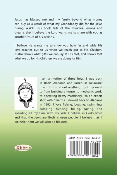 Jesus has blessed me and my family beyond what money can buy as a result of what my Granddaddy did for the Jews during W.W.II. This book tells of the miracles, visions and dreams that I believe the Lord wants me to share with you as another result of his actions. I believe He wants me to show you how far and wide His love reaches out to us when we reach out to His Children. It also shows what gifts we can lay at His feet, and shows that what we do for His Children, we are doing for Him.