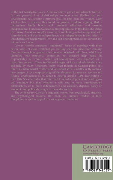 In the last twenty-five years, Americans have gained considerable freedom in thier personal lives. Relationships are now more flexible, and self-development has become a primary goal for both men and women. Most scholars have criticized this trend to greater freedom, arguing that it undermines family bonds and promotes selfishness and extreme independence, Francesca Cancian is more optimistic. In this book she shows that many American couples succeed in combining self-development with commitment, and that interdependence, not independence, is their ideal. In interdependent relationships, love and self-development do not conflict, but reinforce each other. Love in America compares 'traditional' forms of marriage with these newer forms of close relationships. Starting with the nineteenth century, Cancian shows how gender roles became polarized, with love, which was identified with emotional expression, no practical help, being the responsibility of women, while self-development was regarded as a masculine concern. These traditional images of love and relationships are still held by many Americans today, even though, as Cancian points out, this can lead to marital conflict and individual stress and illness. By contrast, new images of love, emphasizing self-development for men and women and flexible, androgynous roles, began to emerge around 1900, accelerating in the 1960s. She concludes that this trend to self-development and androgyny will continue, but that whether it will lead to more interdependent relationships, or to more independence and isolation, depends partly on economic and political changes in the wider society. The evidence for Cancian's argument comes from sociological, historical, and psychological sources. Her book will interest readers in these disciplines, as well s appeal to a wide general audience.