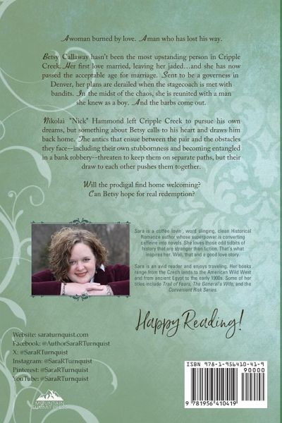 A woman burned by love. A man who has lost his way. Betsy Callaway hasn't been the most upstanding person in Cripple Creek. Her first love married, leaving her jaded...and she has now passed the acceptable age for marriage. Sent to be a governess in Denver, her plans are derailed when the stagecoach is met with bandits. In the midst of the chaos, she is reunited with a man she knew as a boy. And the barbs come out. Nikolai "Nick" Hammond left Cripple Creek to pursue his own dreams, but something about Betsy calls to his heart and draws him back home. The antics that ensue between the pair and the obstacles they face--including their own stubbornness and becoming entangled in a bank robbery--threaten to keep them on separate paths, but their draw to each other pushes them together. Will the prodigal find home welcoming? Can Betsy hope for real redemption? Recommended Reading Order: Hope in Cripple Creek Christmas in Cripple Creek Faith in Cripple Creek Love in Cripple Creek Prequels, to be read in any order Leaving Waverly Leaving Stoneybrook