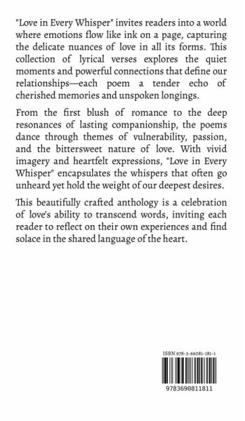 "Love in Every Whisper" invites readers into a world where emotions flow like ink on a page, capturing the delicate nuances of love in all its forms. This collection of lyrical verses explores the quiet moments and powerful connections that define our relationships-each poem a tender echo of cherished memories and unspoken longings. From the first blush of romance to the deep resonances of lasting companionship, the poems dance through themes of vulnerability, passion, and the bittersweet nature of love. With vivid imagery and heartfelt expressions, "Love in Every Whisper" encapsulates the whispers that often go unheard yet hold the weight of our deepest desires. This beautifully crafted anthology is a celebration of love's ability to transcend words, inviting each reader to reflect on their own experiences and find solace in the shared language of the heart.
