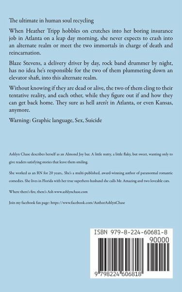 The ultimate in human soul recycling When Heather Tripp hobbles on crutches into her boring insurance job in Atlanta on a leap day morning, she never expects to crash into an alternate realm or meet the two immortals in charge of death and reincarnation. Blaze Stevens, a delivery driver by day, rock band drummer by night, has no idea he's responsible for the two of them plummeting down an elevator shaft, into this alternate realm. Without knowing if they are dead or alive, the two of them cling to their tentative reality, and each other, while they figure out if and how they can get back home. They sure as hell aren't in Atlanta, or even Kansas, anymore. Warning: Graphic language, Sex, Suicide