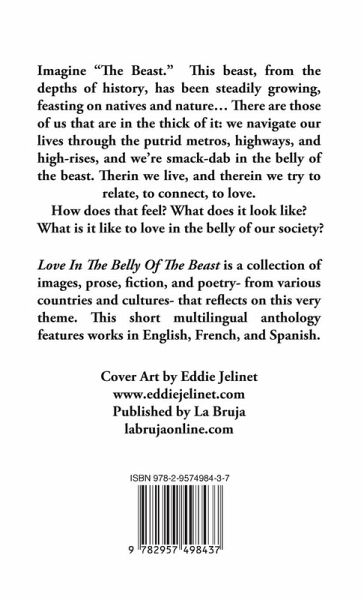 Imagine "The Beast." This beast, from the depths of history, has been steadily growing, feasting on natives and nature... There are those of us that are in the thick of it: we navigate our lives through the putrid metros, highways, and high-rises and we're smack dab in the belly of the beast. Therein we live and therein we try to relate, to connect, to love. How does that feel? What does it look like? What is it like to love in the belly of our society? Love In The Belly Of The Beast is a collection of images, prose, fiction, and poetry - from various countries and cultures - that reflects on this very theme. This short multilingual anthology features works in English, French, and Spanish.