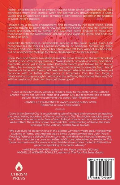 Rome-once the heart of an empire, now the heart of the Catholic Church-has witnessed many love stories. When the Eternal City draws together a Swiss Guard and an American expat, a modern-day romance blooms in the shadow of Saint Peter's Basilica. Haunted by a broken engagement and betrayed by her best friend, Elena Gattino travels to Rome for a new job and the hope of a new life. Fueled by pasta and bolstered by prayer, she becomes brave enough to forge new friendships with the Rechsteiner siblings as she explores Rome and finds her footing at work. Benedikt Rechsteiner is comfortable serving in the Swiss Guard, even if he recognizes his life lacks a special something...or someone. Simmering family tensions and uncertainty about his future have left Beni wary of relationships, but his unexpected feelings for Elena challenge him to face his fears. Soon, Beni and Elena's friendship turns into more, thanks to the matchmaking meddling of a Vatican spymaster, a Swiss Guard comrade-in-arms, and Beni's overenthusiastic yet lovable sister. But then Elena's past follows her to Rome, putting her in danger that even Beni may not be able to save her from. And if Beni wants to be with Elena, he'll need to discern where his own future lies-and reconcile with his father after years of bitterness. Can the two forge a relationship strong enough to withstand the suffering that comes their way? Or will the tensions of their own lives pull them apart?
