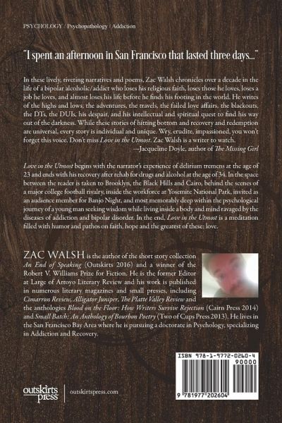 In these lively, riveting narratives and poems, Zac Walsh chronicles over a decade in the life of a bipolar alcoholic/addict who loses his religious faith, loses those he loves, loses a job he loves, and almost loses his life before he finds his footing in the world. He writes of the highs and lows, the adventures, the travels, the failed love affairs, the blackouts, the DTs, the DUIs, his despair, and his intellectual and spiritual quest to find his way out of the darkness. While these stories of hitting bottom and recovery and redemption are universal, every story is individual and unique. Wry, erudite, impassioned, you won't forget this voice. Don't miss Love in the Utmost. Zac Walsh is a writer to watch. -Jacqueline Doyle, author of The Missing Girl Love in the Utmost begins with the narrator's experience of delirium tremens at the age of 23 and ends with his recovery after rehab for drugs and alcohol at the age of 34. In the space between the reader is taken to Brooklyn, the Black Hills and Cairo, behind the scenes of a major college football rivalry, inside the workforce at Yosemite National Park, invited as an audience member for Banjo Night, and most memorably deep within the psychological journey of a young man seeking wisdom while living inside a body and mind ravaged by the diseases of addiction and bipolar disorder. In the end, Love in the Utmost is a meditation filled with humor and pathos on faith, hope and the greatest of these: love.