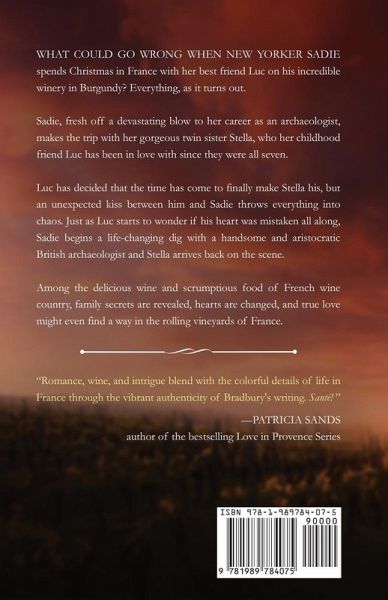 What could go wrong when New Yorker Sadie spends Christmas in France with her best friend Luc on his incredible winery in Burgundy? Everything, as it turns out. Sadie, fresh off a devastating blow to her career as an archaeologist, makes the trip with her gorgeous twin sister Stella, who Luc her childhood friend Luc has been in love with since they were all seven. Luc has decided that the time has come to finally make Stella his, but an unexpected kiss between him and Sadie throws everything into chaos. Just as Luc starts to wonder if his heart was mistaken all along, Sadie begins a life-changing dig with a handsome and aristocratic British archaeologist and Stella arrives back on the scene. Among the delicious wine and scrumptious food of French wine country, family secrets are revealed, hearts are changed, and true love might even find a way in the rolling vineyards of France.
