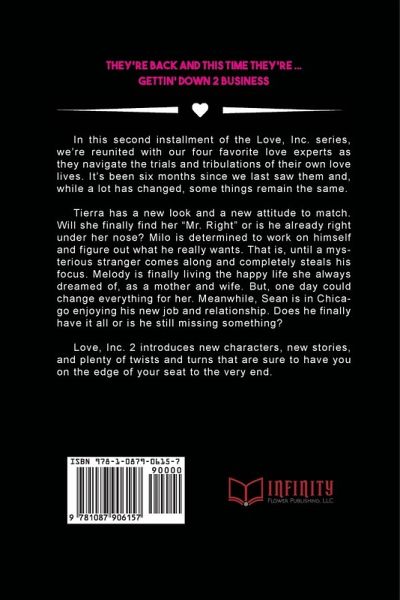 They're back and this time they're...Getting' Down 2 Business In this second installment of the Love, Inc. series, we're reunited with our four favorite love experts as they navigate the trials and tribulations of their own love lives. It's been six months since we last saw them and, while a lot has changed, some things remain the same. Tierra has a new look and a new attitude to match. Will she finally find her "Mr. Right" or is he already right under her nose? Milo is determined to work on himself and figure out what he really wants. That is, until a mysterious stranger comes along and completely steals his focus. Melody is finally living the happy life she always dreamed of, as a mother and wife. But, one day could change everything for her. Meanwhile, Sean is in Chicago enjoying his new job and relationship. Does he finally have it all or is he still missing something? Love, Inc. 2 introduces new characters, new stories, and plenty of twists and turns that are sure to have you on the edge of your seat to the very end.