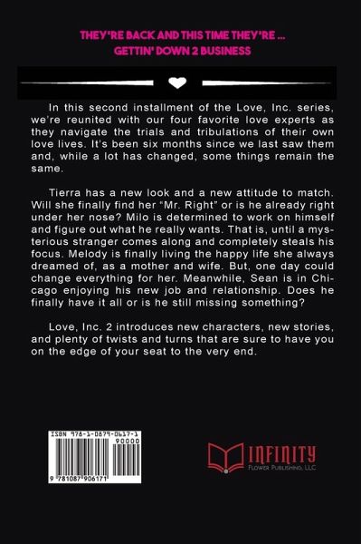 They're back and this time they're...Getting' Down 2 Business In this second installment of the Love, Inc. series, we're reunited with our four favorite love experts as they navigate the trials and tribulations of their own love lives. It's been six months since we last saw them and, while a lot has changed, some things remain the same. Tierra has a new look and a new attitude to match. Will she finally find her "Mr. Right" or is he already right under her nose? Milo is determined to work on himself and figure out what he really wants. That is, until a mysterious stranger comes along and completely steals his focus. Melody is finally living the happy life she always dreamed of, as a mother and wife. But, one day could change everything for her. Meanwhile, Sean is in Chicago enjoying his new job and relationship. Does he finally have it all or is he still missing something? Love, Inc. 2 introduces new characters, new stories, and plenty of twists and turns that are sure to have you on the edge of your seat to the very end.