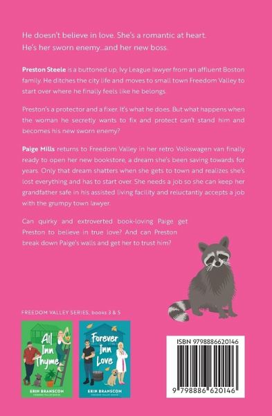 He doesn't believe in love. She's a romantic at heart. He's her sworn enemy...and her new boss. Preston Steele is a buttoned up, Ivy League lawyer from an affluent prominent Boston family. He ditches the city life and moves to small town Freedom Valley to start over where he finally feels like he belongs. His new friends think he could use some fun and love in his life. Only problem is, he doesn't believe real love exists...for him. His new law office badly needs a new office manager. Preston's a protector and a fixer. It's what he does. But what happens when the woman he secretly wants to fix and protect can't stand him and becomes his new sworn enemy? Just one small problem. She's also his new office manager. Paige Mills returns to Freedom Valley in her retro Volkswagen van finally ready to open her new bookstore, a dream she's been saving towards for years. Only that dream shatters before it can even begin when she gets to town and realizes she's lost everything and has to start over again. She needs a job so she can keep her grandfather safe in his assisted living facility and reluctantly accepts a job with the grumpy town lawyer. Can quirky and extroverted book-loving Paige get Preston to believe in true love? And can Preston break down Paige's walls and get her to trust him? *Love Inn Books is a small town, enemies to lovers, grumpy/sunshine, rom-com with office pranks, and a pet raccoon. Love Inn Books is a complete standalone and can be read without any of the other books, but if you prefer to read them in order, start with Falling Inn Love as the characters and families are interconnected.*
