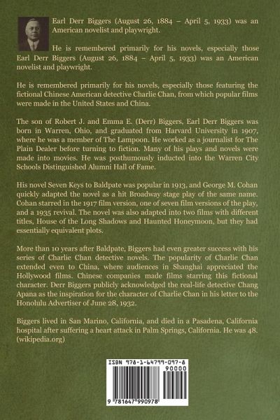 Earl Derr Biggers (August 26, 1884 – April 5, 1933) was an American novelist and playwright. He is remembered primarily for his novels, especially those featuring the fictional Chinese American detective Charlie Chan, from which popular films were made in the United States and China. The son of Robert J. and Emma E. (Derr) Biggers, Earl Derr Biggers was born in Warren, Ohio, and graduated from Harvard University in 1907, where he was a member of The Lampoon. He worked as a journalist for The Plain Dealer before turning to fiction. Many of his plays and novels were made into movies. He was posthumously inducted into the Warren City Schools Distinguished Alumni Hall of Fame. His novel Seven Keys to Baldpate was popular in 1913, and George M. Cohan quickly adapted the novel as a hit Broadway stage play of the same name. Cohan starred in the 1917 film version, one of seven film versions of the play, and a 1935 revival. The novel was also adapted into two films with different titles, House of the Long Shadows and Haunted Honeymoon, but they had essentially equivalent plots. More than 10 years after Baldpate, Biggers had even greater success with his series of Charlie Chan detective novels. The popularity of Charlie Chan extended even to China, where audiences in Shanghai appreciated the Hollywood films. Chinese companies made films starring this fictional character. Derr Biggers publicly acknowledged the real-life detective Chang Apana as the inspiration for the character of Charlie Chan in his letter to the Honolulu Advertiser of June 28, 1932. Biggers lived in San Marino, California, and died in a Pasadena, California hospital after suffering a heart attack in Palm Springs, California. He was 48. (wikipedia.org)