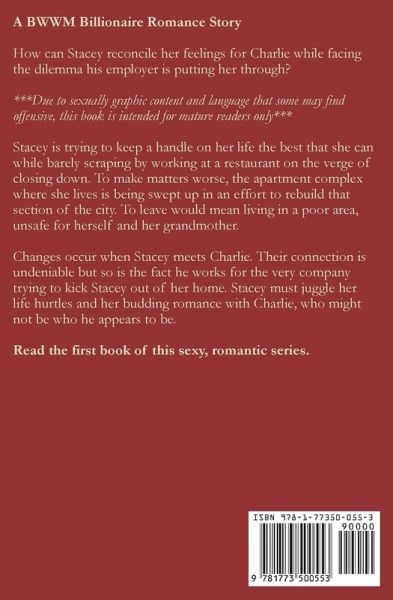 A BWWM Billionaire Romance Story How can Stacey reconcile her feelings for Charlie while facing the dilemma his employer is putting her through? ***Due to sexually graphic content and language that some may find offensive, this book is intended for mature readers only*** Stacey is trying to keep a handle on her life the best that she can while barely scraping by working at a restaurant on the verge of closing down. To make matters worse, the apartment complex where she lives is being swept up in an effort to rebuild that section of the city. To leave would mean living in a poor area, unsafe for herself and her grandmother. Changes occur when Stacey meets Charlie. Their connection is undeniable but so is the fact he works for the very company trying to kick Stacey out of her home. Stacey must juggle her life hurtles and her budding romance with Charlie, who might not be who he appears to be. Read the first book of this sexy, romantic series.