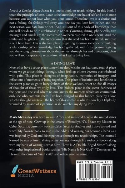 Love is a Double-Edged Sword is a poetic book on relationships. In this book I teach the principle of love. Love is the knowledge one has of self and one's mate because you cannot love what you don't know. Therefore love is a choice and not a feeling, for feelings will sway you; one day you love him or her, and the next season you hate him or her. And it is out of this body of knowledge that one will decide to be in a relationship or not. Courting, dating, phone calls, text messages and emails are the seeds that have been planted in one's heart. And the smiles and laughter are the indications that the seed has been watered, and that it will bear fruit. This is the first phase of getting to know someone or building a relationship. When knowledge has been gathered, and if that person is giving you the wrong information about themselves, through lies and deceptions, then you will soon experience separation: what I call a dying love. A DYING LOVE. Most of us have a secret place somewhere deep within our heart and soul. A place where we go to sort things through, when feelings of love become overwhelmed with pain. This place is thoughts of imagination, memories of imagery, and reflections of moments of being together. This place of isolation and loneliness is the secret place we go to bury feelings of those we love, or set on fire all images of thought of those we truly love. This hidden place is the secret darkness of the heart and the soul where no one knows the murders which are committed, only she who commits them. I've been dragged to this hidden place by a love which I thought was true. The heart of this woman is where I now lay. Helplessly wounded by reason of separation as she watches my dying love.