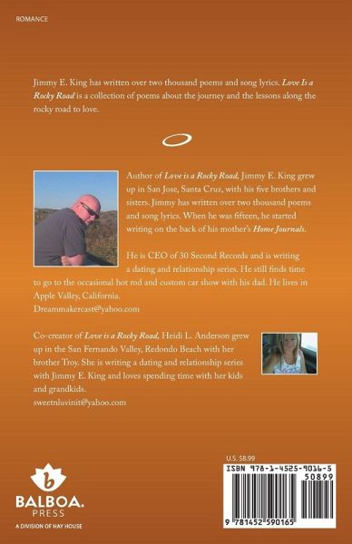 Author of Love is a Rocky Road, Jimmy E. King grew up in San Jose, Santa Cruz, with his five brothers and sisters. Jimmy has written over two thousand poems and song lyrics. When he was fifteen, he started writing on the back of his mother's Home Journals. He is CEO of 30 Second Records and is writing a dating and relationship series. He still finds time to go to the occasional hot rod and custom car show with his dad. He lives in Apple Valley, California. Dreammakercast@yahoo.com Co-creator of Love is a Rocky Road, Heidi L. Anderson grew up in the San Fernando Valley, Redondo Beach with her brother Troy. She is writing a dating and relationship series with Jimmy E. King and loves spending time with her kids and grandkids. sweetnluvinit@yahoo.com