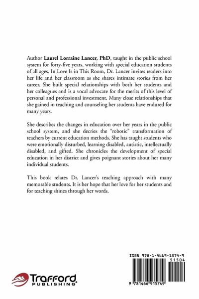 Author Laurel Lorraine Lancer, PhD, taught in the public school system for forty-five years, working with special education students of all ages. In Love Is in This Room, Dr. Lancer invites readers into her life and her classroom as she shares intimate stories from her career. She built special relationships with both her students and her colleagues and is a vocal advocate for the merits of this level of personal and professional investment. Many close relationships that she gained in teaching and counseling her students have endured for many years. She describes the changes in education over her years in the public school system, and she decries the "robotic" transformation of teachers by current education methods. She has taught students who were emotionally disturbed, learning disabled, autistic, intellectually disabled, and gifted. She chronicles the development of special education in her district and gives poignant stories about her many individual students. This book relates Dr. Lancer's teaching approach with many memorable students. It is her hope that her love for her students and for teaching shines through her words.