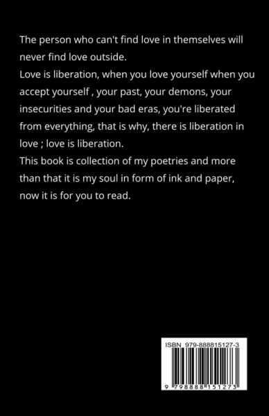 The person who can't find love in themselves will never find love outside, this book is a collection of poems that depicts the journey of fighting demons and learning to love yourself anyway Love is liberation when you love yourself when you accept yourself, your pasts, your demons, your insecurities, and your bad eras, you're finally at peace because instead of fighting yourself, you heal and love your wounded inner child, and you are liberated from everything, that is why there is liberation in love; love is liberation.