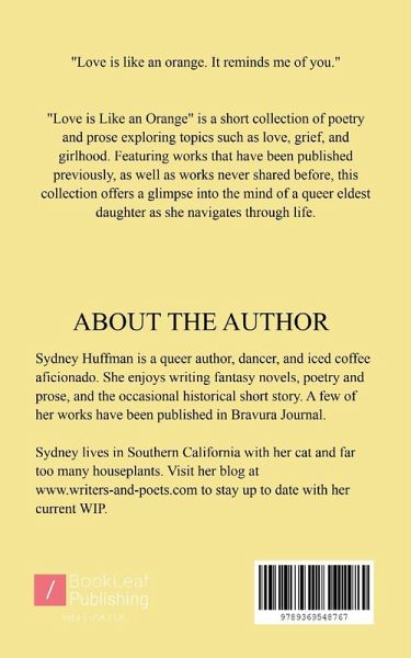 ""Love is like an orange. It reminds me of you."" ""Love is Like an Orange"" is a short collection of poetry and prose exploring topics such as love, grief, and girlhood. Featuring works that have been published previously, as well as works never shared before, this collection offers a glimpse into the mind of a queer eldest daughter as she navigates through life.