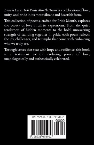 Love is Love: 100 Pride Month Poems is a celebration of love, unity, and pride in its most vibrant and heartfelt form. This collection of poems, crafted for Pride Month, explores the beauty of love in all its expressions. From the quiet tenderness of hidden moments to the bold, unwavering strength of standing together in pride, each poem reflects the joy, challenges, and triumphs that come with embracing who we truly are. Through verses that soar with hope and resilience, this book is a testament to the enduring power of love, unapologetically and authentically celebrated.