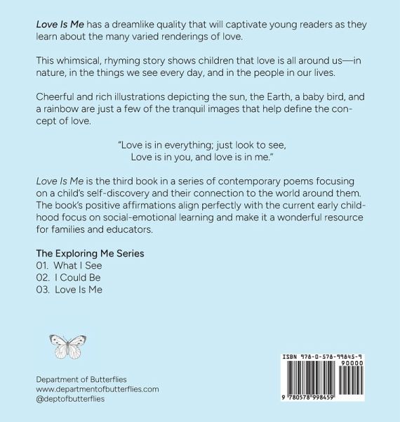 Love Is Me has a dreamlike quality that will captivate young readers learning about the many varied renderings of love. A whimsical rhyming story shows children that love is all around us, in nature, in the things we see every day, and in the people in our lives. Cheerful and rich illustrations depicting the sun, our Earth, a baby bird, and a rainbow are a few of the tranquil images that help to define the concept of love. Love is in everything; just look to see, Love is in you, and love is in me. Love Is Me is the third book in a series of contemporary poems focusing on a child's self-discovery and their connection to the world around them. The book's positive affirmations perfectly align with the current early childhood focus on social-emotional learning and is a wonderful resource for families and educators.